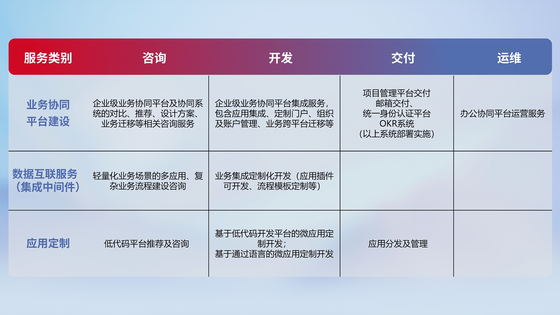 针对钉钉、、、、企微、、、、IDaas等平台级产品提供产品的规划、、方案、、交付、、定制化开发等服务,,实现如统一协同办公、、、、智能客户服务、、、、混合会议管理、、智能数据查询、、、等业务场景,,,,实现数字化转型。。。
